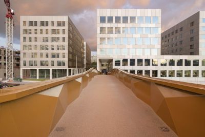 Tekst: De huidige stedenbouwkundige situatie van de omgeving rond de Fransmanstraat in Laken is erg complex. De treinsporen delen de straat op een brutale wijze in twee. De topografie is ingewikkeld en de bestaande hellende vlakken tonen aan dat er gebrek is aan een goed gedefinieerde publieke ruimte. De sokkels moeten nieuwe publieke ruimten creëren en de toegankelijkheid en leesbaarheid van de brug en de plek verbeteren. De voetgangersbrug bestaat uit geplooide staalplaten, die geprefabriceerd en vervolgens gemakkelijk gemonteerd kunnen worden.