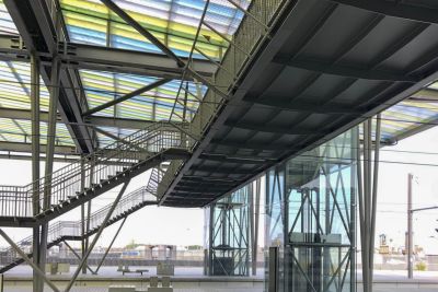 De bouw van de stalen voetgangerspasserelle over de sporen maakte eveneens deel uit van het masterplan Oostende Stationsomgeving.</p>