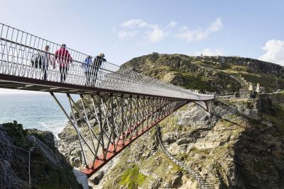 Tekst: <p>De voetgangersbrug van het kasteel van Tintagel is gebaseerd op een eenvoudig concept: de link die ooit bestond en de leegte opnieuw vullen. In plaats van de invoeging van een derde element dat de beide kanten raakt, werden er twee afzonderlijke uitkragende brugdelen gebouwd die elkaar bijna aanraken in het midden. De nieuwe brug verbetert de ervaring van de site voor de bezoeker. De route van de hoofdtoegang gaat via de historische binnenpoort en biedt een spectaculair uitzicht op de kasteelruïne en het eiland Tintagel. De brug heeft een totale lengte van ongeveer 70 m. De 4,5 m hoge structuur die uit de rotswand komt, verslankt tot een dikte van 17 cm in het centrum.</p>