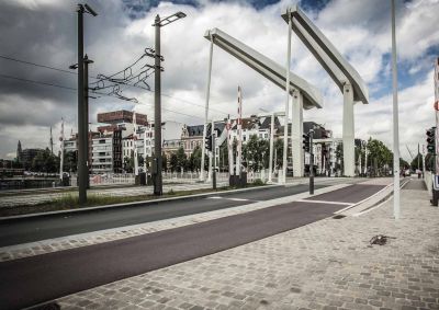 Le nouveau Vlasbrug est un pont en acier formant un S d’une longueur totale de 165 m et d’une portée de 76 m au-dessus de la Lys. La société momentanée TM Van Huele - Aelterman s’est chargée des travaux et les sections en acier du pont ont été préfabriquées dans l’atelier d’Aelterman. La conception, signée SBE, est sobre mais harmonieuse et s’intègre aux alignements d’arbres et au paysage ouvert de la Lys. Les rampes d’accès en béton se connectent parfaitement aux chemins de halage de part et d’autre de la Lys.