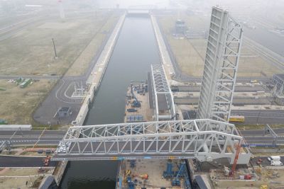 Tekst: <p>Deux ponts basculants en acier franchissent depuis peu la nouvelle écluse de Kieldrecht dans le port d’Anvers. Destinées au trafic routier, elles viennent s’ajouter aux ponts déjà achevés pour le trafic mixte (routier, ferroviaire et portuaire). Apporter une réponse à la question de la fatigue fut l’un des principaux défis lors de la conception. Il s’agit de ponts basculants en équilibre dont le contrepoids est logé dans une fosse profonde. Leur structure porteuse est constituée d’une poutre en treillis.</p>
