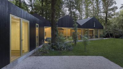 Tekst: <p>Cet ancien chalet en bois a été transformé en une maison individuelle contemporaine, la volumétrie de l’extension étant adaptée au positionnement des chênes environnants. <br>La structure de base des volumes de l’extension (à gauche et à droite du chalet existant) est construite comme un squelette métallique. Elle est revêtue de panneaux sandwich sur les zones de murs et de toit (KS1000RW et KS1000XD de Kingspan), après quoi une finition intérieure et extérieure de haute qualité - respectivement des plaques de plâtre et un revêtement en bois huilé noir - a été réalisée pour donner à l’ensemble un look raffiné. <br>À hauteur de la façade anodisée de couleur or, une structure métallique en treillis a été placée sur des points d’appui minimaux afin de soutenir l’ancienne structure de plancher, souligner la structure du toit et accueillir la nouvelle façade avec les travées de toiture. La structure métallique représente environ 7 tonnes d’acier S235JR, répartis entre HE 140 A, HE 140 B, IPE 270, acier plat 50x120, etc.</p>