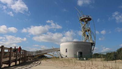 Tekst: <p>L’ancien château d’eau de la réserve naturelle de Warandeduinen exigeait une rénovation en profondeur. Toutefois, il devait pouvoir conserver sa fonction initiale et continuer à approvisionner une bonne partie de Middelkerke en eau potable. C’est la raison pour laquelle le socle a été conservé de telle sorte que la station de pompage puisse continuer à alimenter le réseau de distribution. </p><p>Dans le nouveau projet, une chemin sur pilotis s’élève pour se transformer en pont, limitant ainsi les dommages causés au sol naturel. La nature, le sable et le vent peuvent s’en donner à cœur joie. Il s’agissait de créer une nouvelle structure au-dessus de la base existante. Un surprenant faisceau de tubes serpente autour de l’escalier en colimaçon. Cet éventail de tubes galvanisés et laqués fait référence aux oyats, les si typiques joncs des dunes. Ces brins d’acier soutiennent l’escalier en colimaçon, une plateforme de repos et une plateforme panoramique située à 20 m de haut.</p>