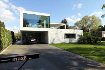 Tekst: Een bungalow uit de jaren zestig, waarvan het interieur reeds was gerenoveerd, werd omgebouwd tot een modern en open kantoor met woning. De staalconstructie van het kantoor liet toe om de verdieping te laten uitkragen en hierdoor een open carport te creëren. De gevels van zowel de uitbreiding als de bestaande woning werden afgewerkt met zelfdragende stalen voorgelakte sandwichpanelen (Kingspan Evolution) en extra minerale wol. De staalbouw leverde verleende het gebouw een eigen karakter en vormgeving.