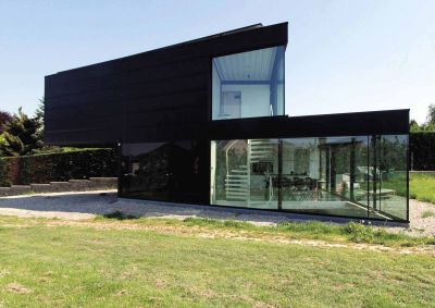 Tekst: <p>Cette habitation unifamiliale à Merelbeke a été réalisée avec une structure en acier invisible de l’extérieur. Des panneaux lisses blancs en béton et des panneaux sandwich métalliques sombres ont été montés sur cette structure. Les panneaux métalliques préfabriqués Kingspan ont une isolation de 10 cm PUR et sont revêtus tant à l’intérieur qu’à l’extérieur d’un platelage métallique plat. Leurs côtés extérieurs ont été alignés avec les panneaux de façade préfabriqués et isolés en béton. Une structure en acier secondaire a été réalisée à cette fin avec des profilés en L. Les poutres primaires de la structure en acier sont également en forme de L de manière à ce que le plafond se prolonge autant que possible de manière continue. Elles sont dissimulées dans l’épaisseur du plancher. Les murs intérieurs sont tous non porteurs et ont été répartis selon le rythme des poutres et colonnes de la structure en acier.</p>