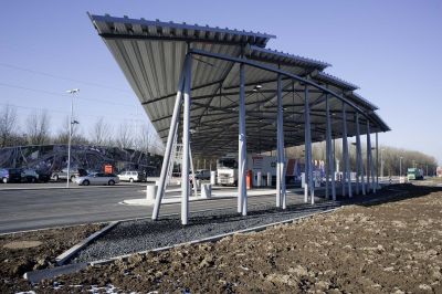• Tekst: <p>La double station-service de Ruisbroek s’étend symétriquement de part et d’autre de l’autoroute E19, aux portes de Bruxelles. La distribution de carburant est implantée à 45° en correspondance avec l’aménagement paysager du site. Elle est protégée par un auvent en acier à couverture courbe formée de cinq facettes longitudinales en bacs nervurés. La structure effilée est constituée de poutres lenticulaires avec câbles de contreventement supportées par des colonnes tubulaires jumelées. Les façades en panneaux acier de la boutique adjacente sont tapissées de photos aériennes monumentales de la ville de Bruxelles et de sa périphérie. La station Est, à la sortie de Bruxelles, est complétée par un bâtiment restaurant et un distributeur d’hydrogène liquide habillé d’acier déployé galvanisé. La station Ouest, vers l’entrée de la capitale, est annoncée par la façade monumentale d’un hôtel (en construction) implanté comme un pavillon dans un parc.</p>