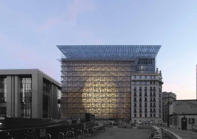 Tekst: <p>La nouvelle extension de la BEI, dénommée ‘Bâtiment Est’ s’intègre dans la paysage sous la forme compacte d’un cylindre de verre, étiré sur la longueur du site et encastré dans le