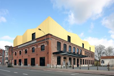 Tekst: Voor de realisatie van het museumprogramma wordt op het dak een loods in staal gebouwd, een logische extensie van de industriële constructie. Het raster van de bestaande stalen kolommen wordt voortgezet. De balken worden er op wisselende hoogtes diagonaal overheen gelegd. De bekleding met goudkleurige metalen golfplaten is een toespeling op de Golden River, de Leie, die bekend staat voor het vlas. In de bestaande draagstructuur werd een monumentale stalen trap ingepast.