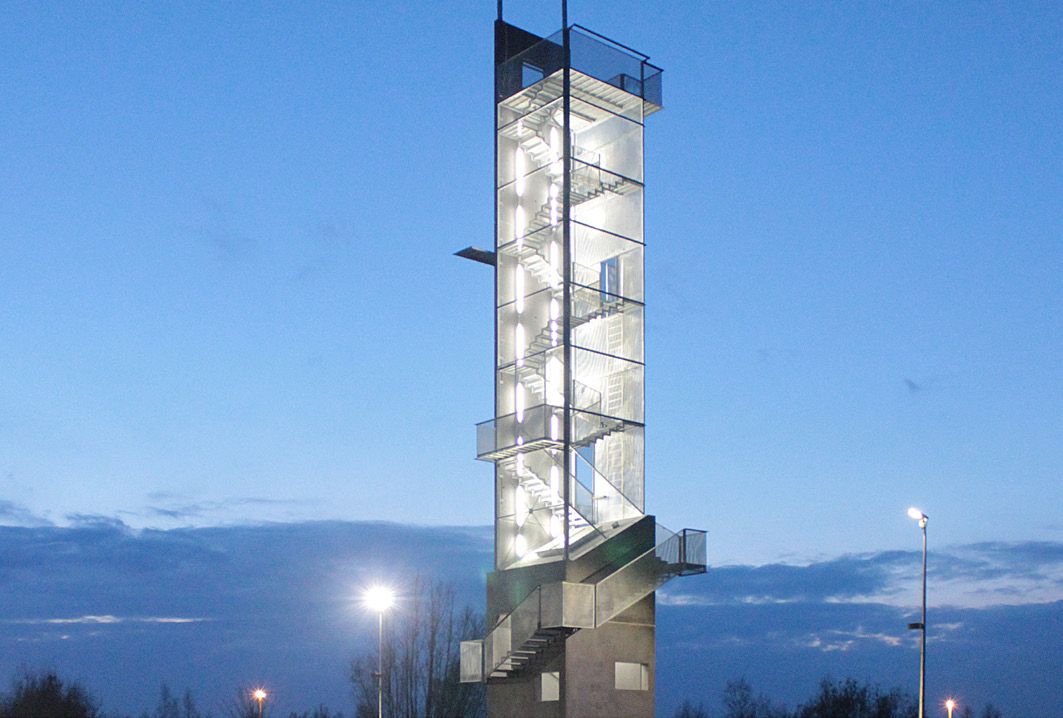 La forme ronde du bâtiment principal découle directement du tracé des flux des véhicules d’intervention. Deux voies de circulation sont prévues : l’une, interne, pour les retours d’intervention et l’autre, externe, pour les départs d’intervention. Une tour d'exercice en acier galvanisé à chaud jouxte le bâtiment principal. Elle s'appuie sur une base en béton de 3 m de côté. C'est une tôle perforée, de 2 mm d'épaisseur seulement, qui assure à elle seule le contreventement de la tour métallique d'une hauteur de 25 m.