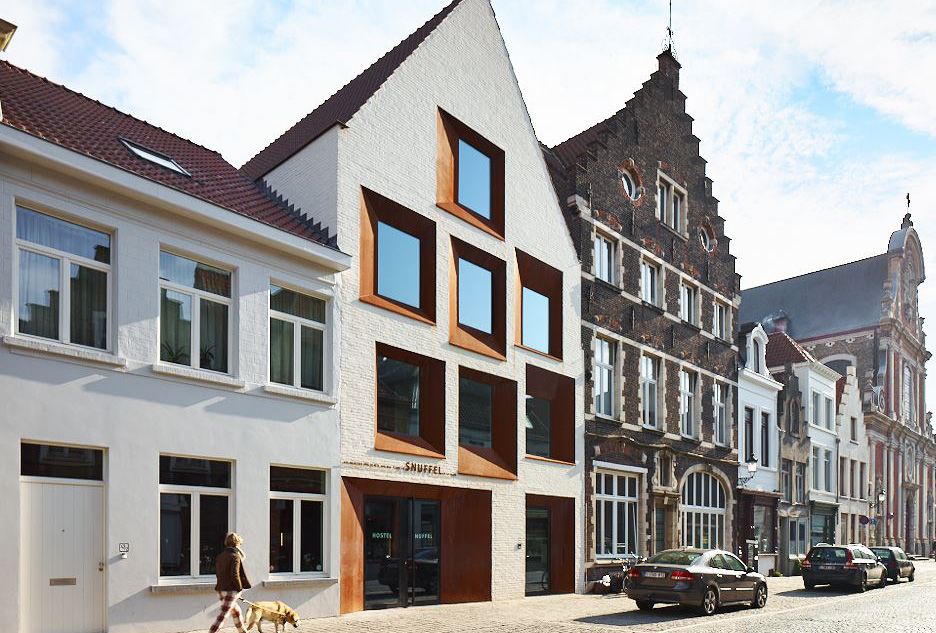 Les châssis uniques en acier résistant aux intempéries (« corten ») se remarquent directement. Ils sont chacun fraisés avec du texte ou des illustrations et forment une interprétation contemporaine des encadrements de fenêtres classiques. En plaçant le verre dans le plan du cadre en acier, les encadrements deviennent invisibles et les fenêtres fonctionnent comme des photos polaroïd dont le touriste devient lui-même partie.