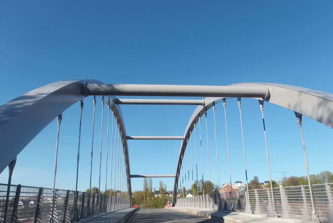 Aux abords de la gare de Ciney, une passerelle devait être construite pour garantir un passage plus aisé dans le trafic de plus en plus dense. Le pont « bowstring » réalisé est long de 75 m, haut de 15 m et large de 13 m. Il est constitué de deux poutres principales en I et de deux supports transversaux finaux. Les arcs en profil de gaine supportent chacun dix-sept suspentes. Le poids total de l’acier est de 510 tonnes. Le montage de l’ensemble du pont a été effectué sur des tours temporaires.