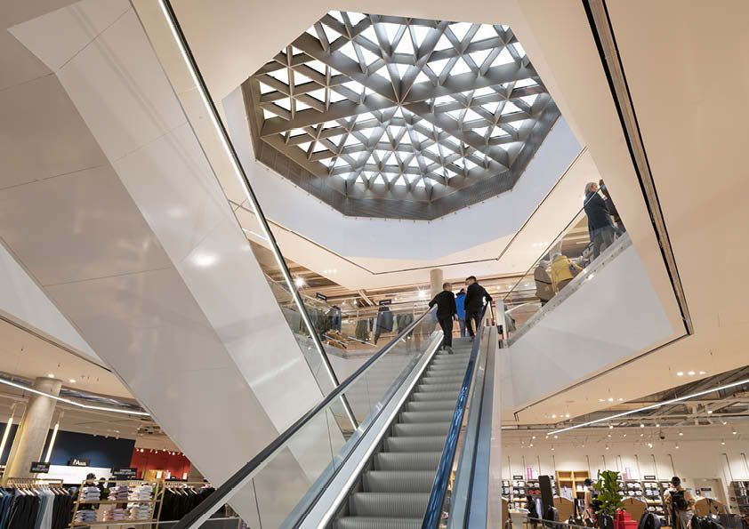 Royal-Hamilius is een gemengd project met woningen, kantoorruimtes en winkels dat uit vijf gebouwen bestaat, waarvan het emblematische B1 de Galeries Lafayette huisvest. Het gebouw wordt gekenmerkt door een niet-structurele stalen gevel met de vorm en de uitstraling van een diamant. De hoofdgevel is bevestigd aan de gewapende betonnen draagstructuur van het gebouw. Er is 97 ton S355JR-staal gebruikt voor de gevel en 22 ton voor het glazen dak boven het centrale atrium – hoofdzakelijk buisprofielen met standaardafmetingen. De keuze voor staal is vooral ingegeven door de zeer grote afstand tussen de verticale profielen van de vliesgevelconstructie – een horizontale overspanning van 9,09 meter – waardoor het gebruik van aluminium onmogelijk was. Het restaurant op het dak bestrijkt de twee bovenste verdiepingen. De staalconstructie (54 ton S355JR-staal) is een kunstwerk op zich, want geen enkel element is verticaal – zelfs de kolommen niet.