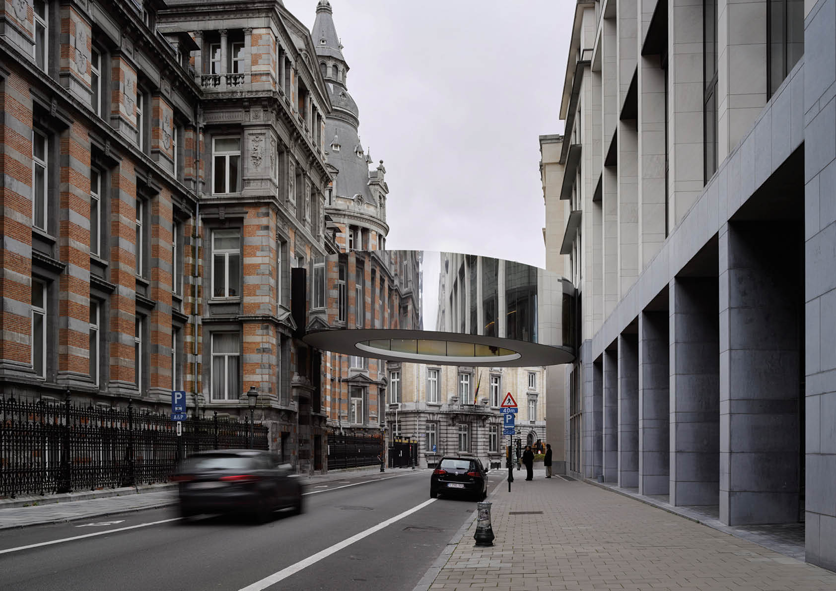Federale parlementsleden die zich moeten verplaatsen tussen het historische Huis van de Parlementsleden en het Forumgebouw, het nieuwe vergadercomplex aan de overkant van de straat, hoeven dat voortaan niet meer in openlucht te doen. Sinds kort kunnen ze de oversteek maken via een fraaie ringvormige passerelle met spiegelgevels. De licht hellende brug kreeg de naam ‘Tondo’, naar de ronde schilderijtjes die erg populair waren tijdens de Renaissance, en is grotendeels opgetrokken uit staal.